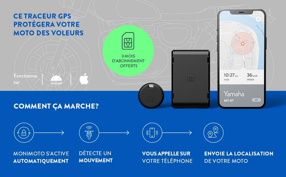 Le Monimoto 7 se compose d’un boitier au format équivalent à un paquet de cigarettes (9,5x6x2cm), ainsi qu’un badge (porte clé) à porter sur soi, en général sur le trousseau de clés de votre véhicule. Le boitier est autonome et n’a donc pas besoin d’être relié à la batterie de votre véhicule. Grâce son autonomie jusqu’à 3 ans et demi (en fonction des réglages et de l’usage), vous pourrez le cacher comme il se doit !